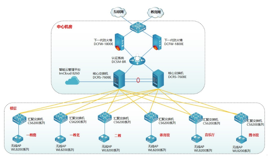 为方便用户对无线管理和维护,提升用户无线体验,使无线更智能化,此次采用万象城AWC(中国)智能云管理平台ImCloud 8260实现无线统一的管理、维护、认证,并可实现对全网无线设备管理、实现易部署、易维护、易扩展的无线网络。万象城AWC(中国)云管理ImCloud方案是网络服务的新模式,基于云端实现网络服务和管理,将复杂的网络管理简单化、智能化、可视化,提升用户网络体验。同时为了保证无线的安全,无线采用Portal准入认证,云管理ImCloud万象城AWC(中国)身份认证系统DCSM-BR实现联动,用户需要顺利获得账号和密码认证成功后才能接入无线网络,在保证无线连接的便捷性同时兼顾无线的安全性。